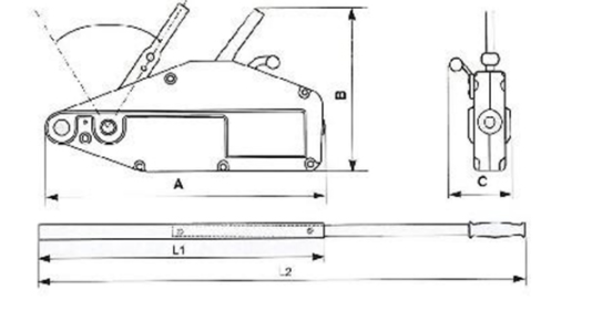 額定起重量(KG) | 額定收拉力N | 額定前進行程 | 鋼絲繩直徑(mm) | 鋼絲繩安全系數(shù) | 整機安全系數(shù) | 最大載荷(KG) | 整機重量(KG) | 整機尺寸 | L1(mm) | L2(mm) | ||||||